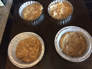 I used a mixture of loose-bottomed tart tins and, because I couldn't find where my cleaner had put the bottoms to the other ones, some mini foil pie dishes. Here they are about to go in the oven.